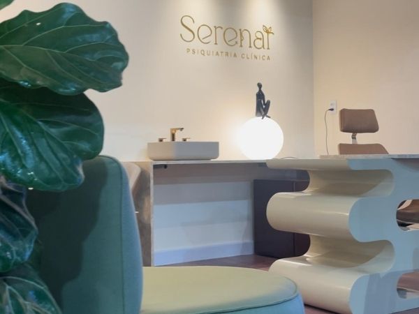 Outro projeto que encantou o público foi o stand de uma clínica psiquiátrica, pensado para acolher. Os estudantes apostaram em tons claros, iluminação delicada, mobiliário com textura e uma pintura em tom sobre tom logo na entrada, criando uma atmosfera de aconchego e empatia. O uso de elementos orgânicos — no tapete, sofá e bancada — reforçou a ideia de humanização e conforto no cuidado com o outro.